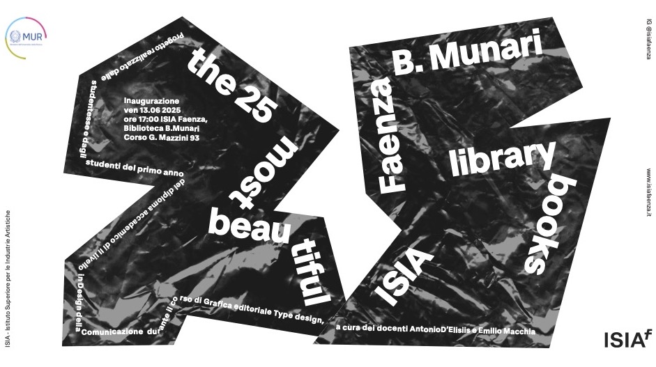 The 25 most beautiful ISIA Faenza B. Munari library books presenta una selezione dei 25 libri più significativi tra quelli conservati all’interno della Biblioteca “Bruno Munari” di ISIA Faenza, la prima in Emilia-Romagna a essere dedicata specificamente al Design. I volumi sono stati individuati dai Corsi di “Grafica editoriale” e “Type Design” del primo anno del Diploma Accademico di II livello in Design della Comunicazione. La selezione si è basata su criteri legati al valore tecnico, alla qualità del progetto grafico, dell’editing, della stampa, nonché al rapporto tra forma e contenuto. Studentesse e studenti hanno successivamente progettato i relativi cataloghi con l’obiettivo di restituire questa selezione. L’esperienza rappresenta un’occasione per esplorare e sperimentare un rapporto originale e consapevole tra contenuto e forma considerando il libro come un oggetto da leggere, osservare, toccare e interpretare.